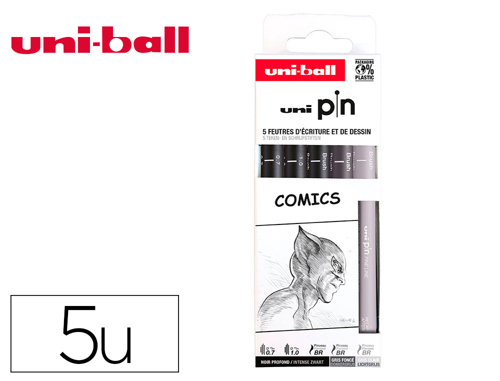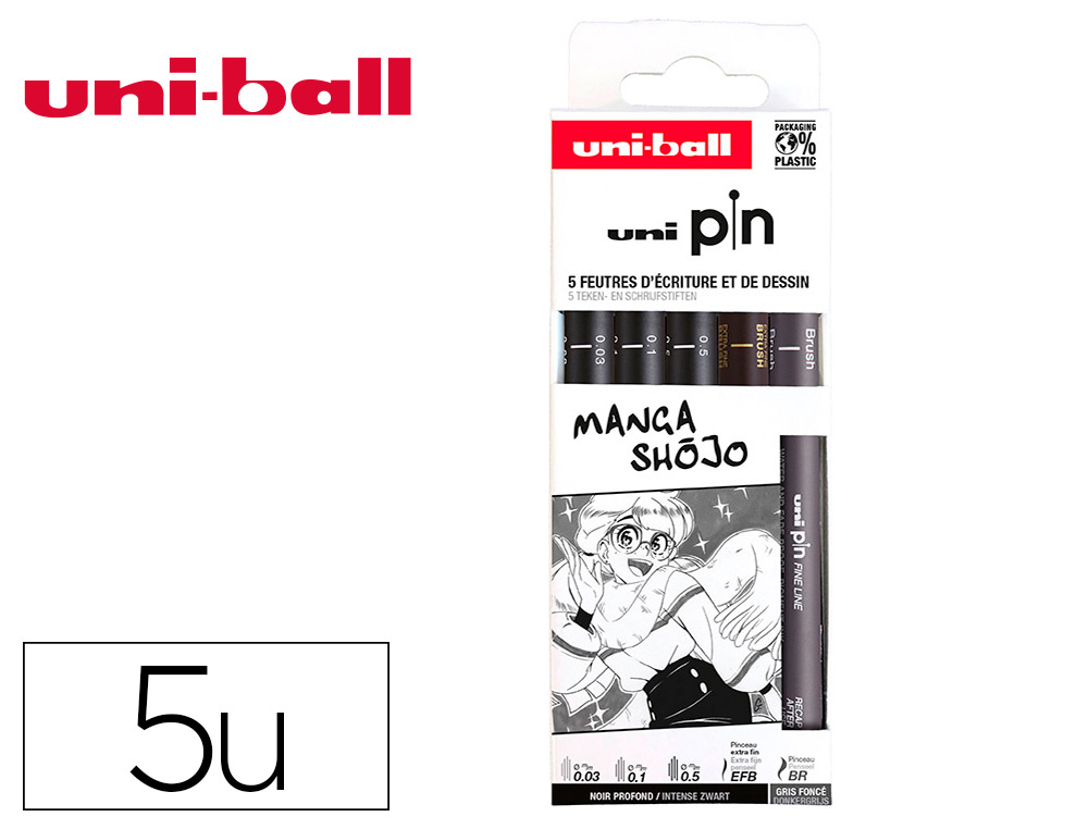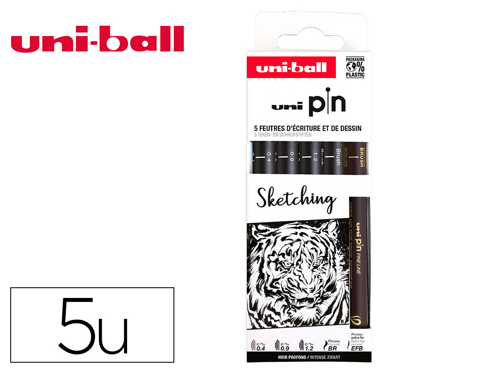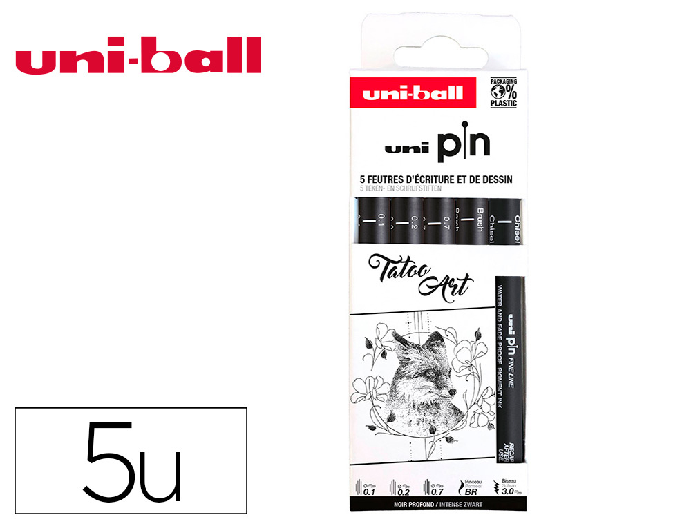 La pochette Uni-ball de 5 feutres pointe calibrée 0.05 mm en noir est un choix de haute qualité pour ceux qui recherchent des instruments d'écriture et de dessin précis et fiables. La finesse de la pointe permet une précision exceptionnelle, adaptée à des utilisations variées comme le dessin technique, les illustrations et l'écriture détaillée.
