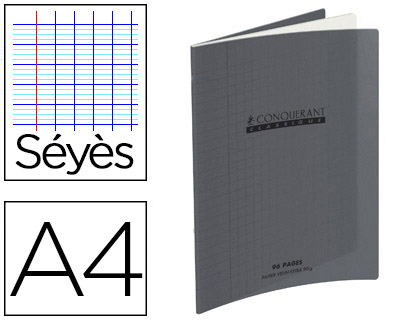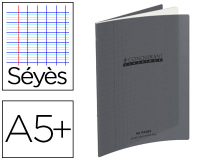 Cahier piqué conquérant classique couverture polypropylène rigide transparente 17x22cm 96 pages 90g séyès coloris gris