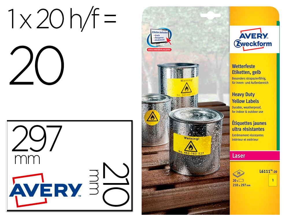 Étiquette adhésive avery ultra-résistante impression laser 210x297mm pochette 20 unités