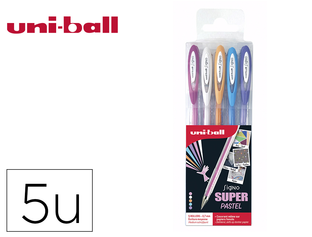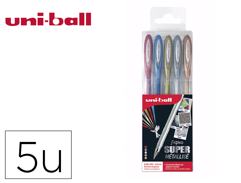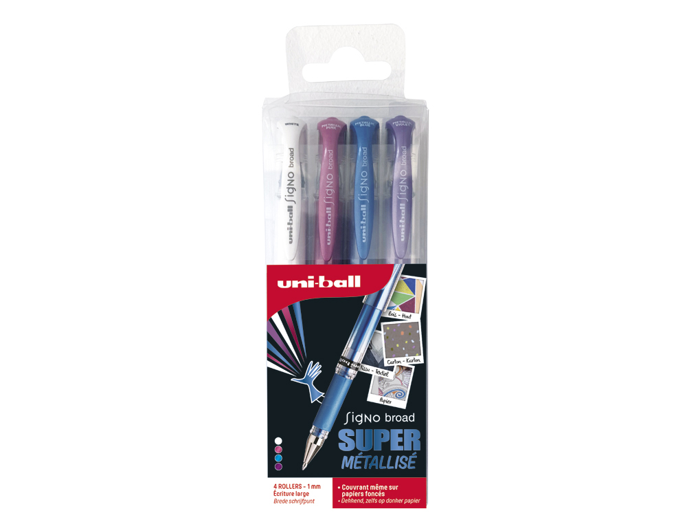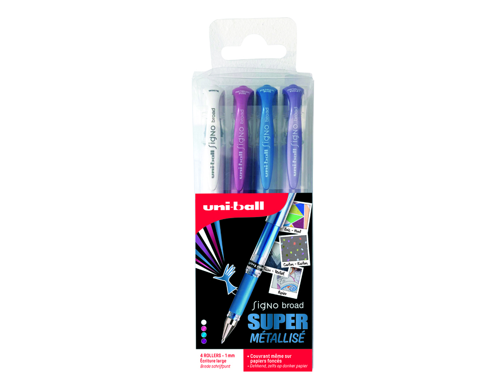 Pochette uniball signo roller ecriture moyenne coloris 1 or 1 argent metallise 1 blanc 1 or paillete 1 argent paillete