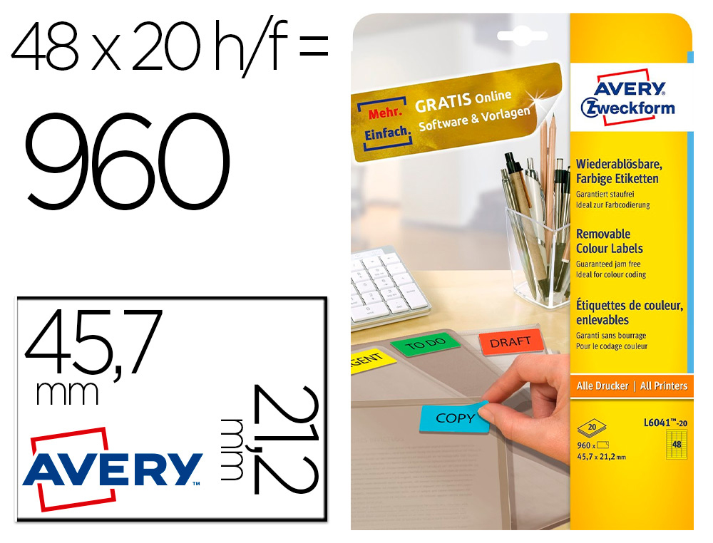 - Dimensions et Format : Chaque étiquette mesure 21,2 x 45,7 mm, avec un total de 960 étiquettes par boîte.